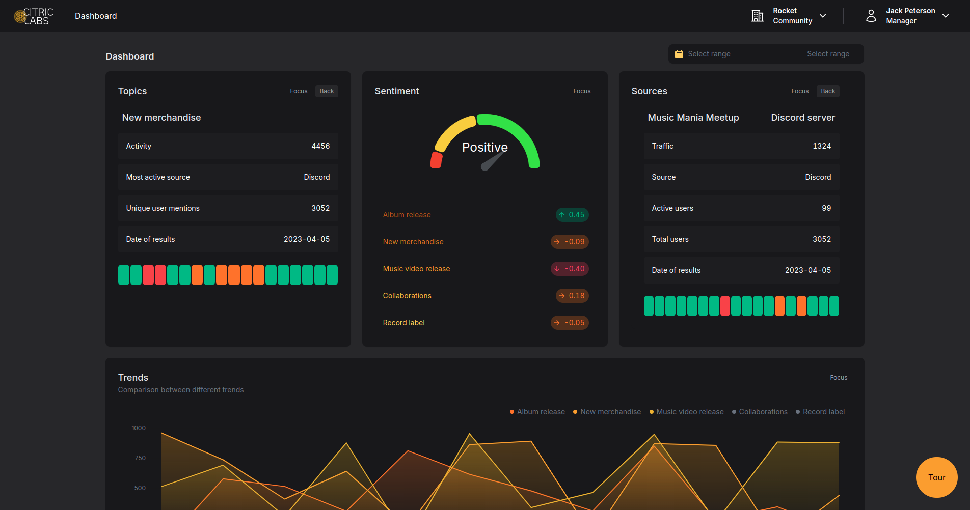 The result is an analytics dashboard, with a modular customisable layout, in-depth functionality showcasing data sources, sentiment analysis, and in-depth topic functionalities