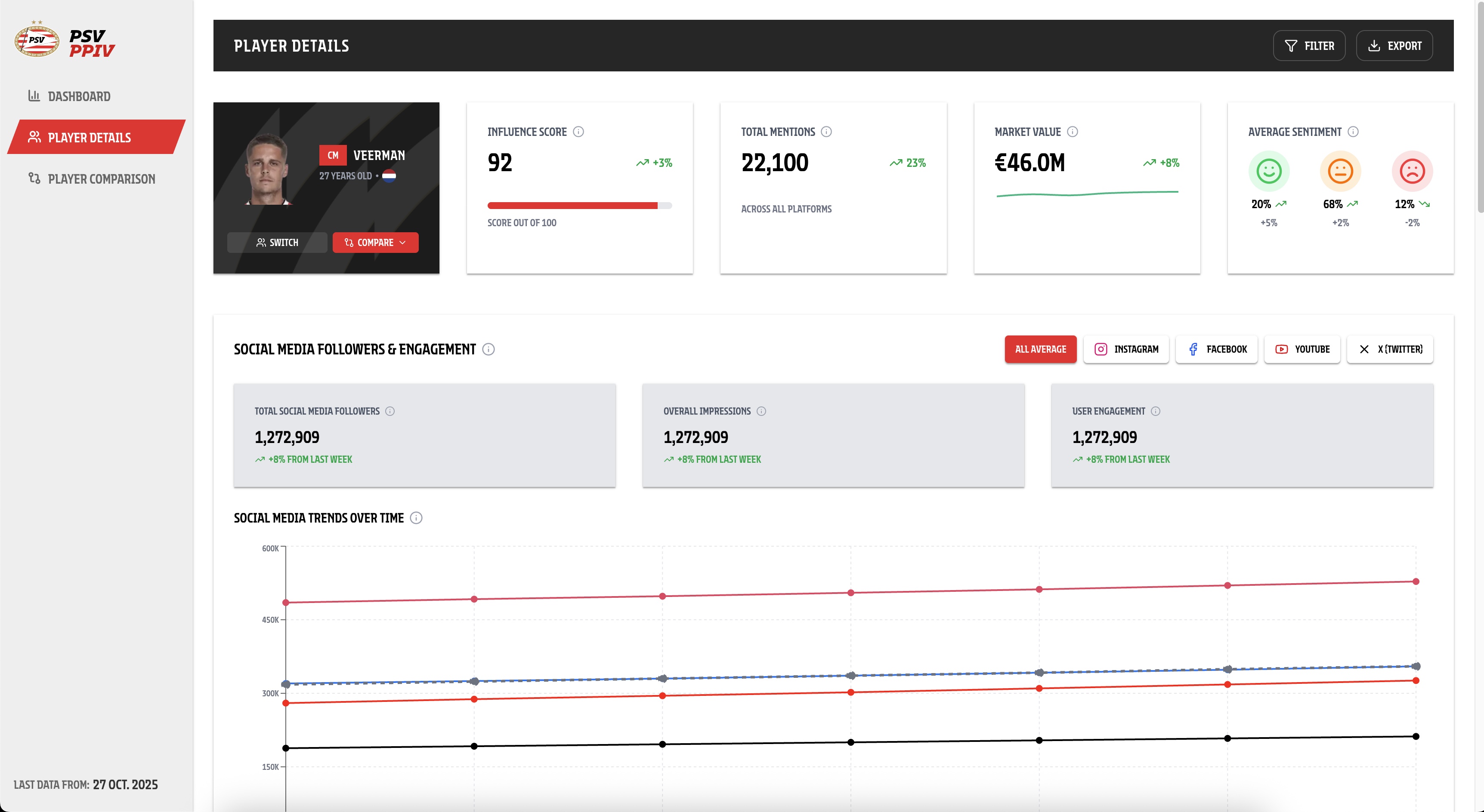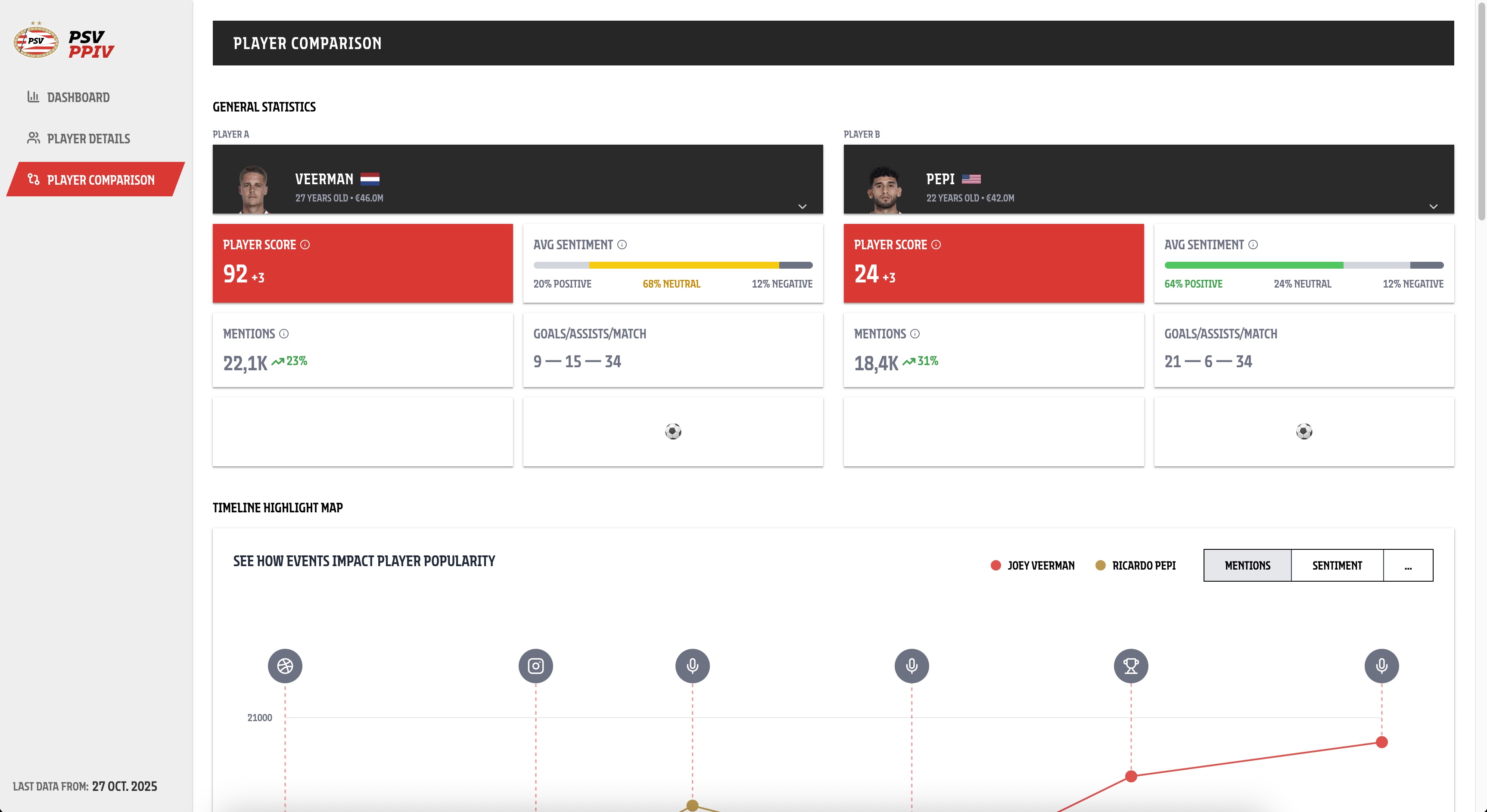 The most important outcome of this project is the Player Popularity Dashboard, a visual MVP that provides football clubs with a clear and structured overview of player popularity and related performance indicators. The dashboard is designed to give stakeholders an immediate, high-level overview of the entire club, including an overall popularity score and key statistics. From this overview, users can navigate to a player detail page for deeper insights or use a comparison page to compare players against each other. While the dashboard was initially developed for PSV, its structure and design allow it to be reused by other football clubs through rebranding, making it a scalable and transferable product.