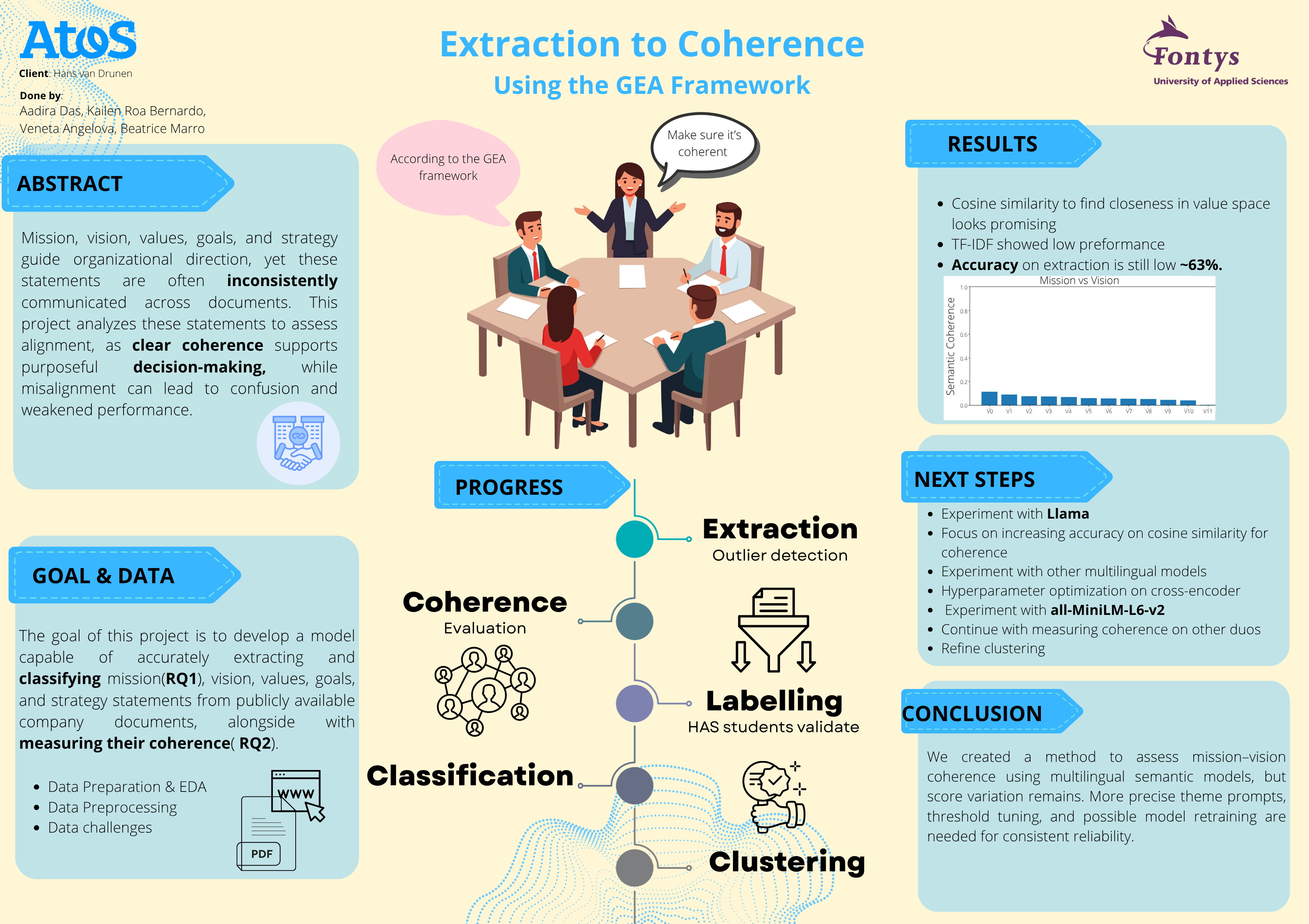 This project aims to extract and measure the coherence between company statements such as mission, vision, values, goals, and strategy. Using NLP, statements are converted into sentence embeddings and compared with cosine similarity to assess semantic alignment. The results are presented in excel coherence matrices to support expert evaluation of strategic consistency.