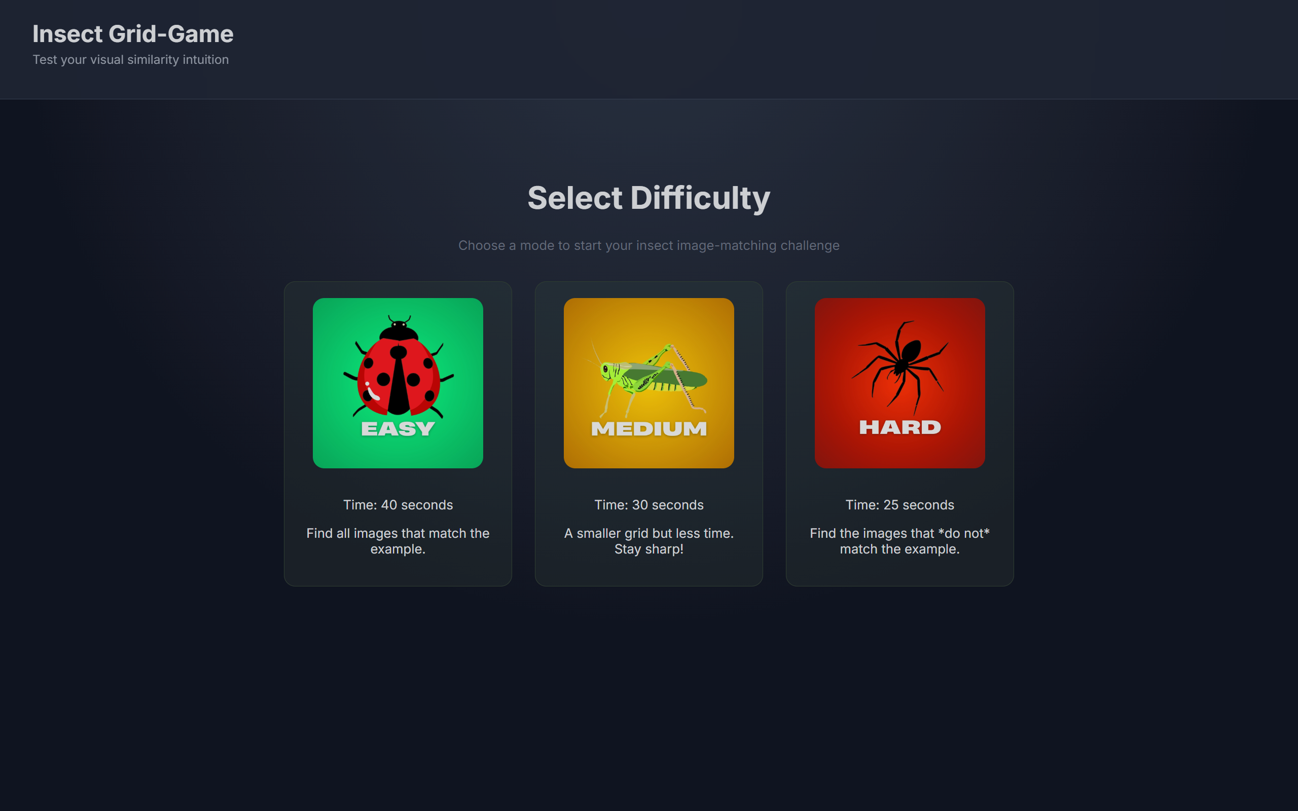 Additionally, for the poster event during the midterm, we prepared a game that helps protray the problem to our audience/ users. It is a grid-game that presents an example image, then in a grid of images that are from the data, the user must pick the images of insects they think are the same family of the example image. Through this gamification, our audience was placed in our model's position were able to see the same difficulties and obstacles we faced.
