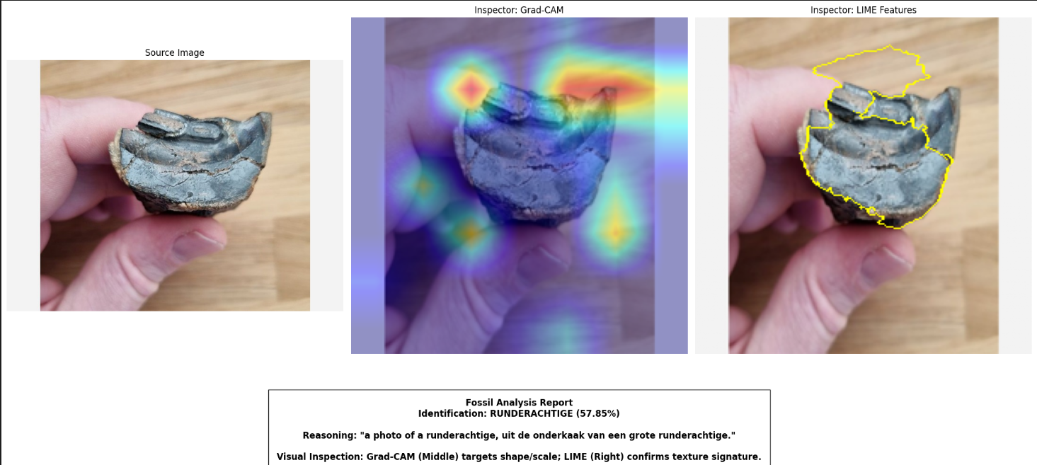 The explainable AI system combines three agents: one for identification, one for natural-language reasoning, and one for visual explanations. This produces a clear, human-readable chain of thought that helps experts and citizen scientists understand why the system makes certain predictions. Validation showed that the system can correctly identify common fossil types and expose hidden model biases, such as relying on scale bars instead of real fossil features. This insight is extremely valuable, because it proves that confidence scores alone are not trustworthy without transparency. Latency tests confirmed that fast explanations like Grad-CAM are suitable for field use, while heavier methods like LIME are better for expert review. The system works reliably in a lab setting and demonstrates modularity and scalability, placing it at TRL 4–5.