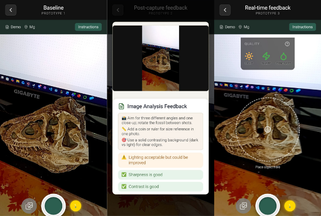 The second outcome is a set of mobile photography prototypes that test whether feedback can improve citizen-scientist image quality. Three versions were developed: no feedback, post-capture feedback, and real-time feedback during image capture. A user study with 20 participants and 183 images showed that real-time feedback significantly improves photo contrast and is rated as the most usable system. Post-capture feedback had little effect, confirming that quality issues must be corrected while the user is taking the photo, not afterwards. These findings also highlight a major insight: improving the quality of photographs at the moment of capture directly reduces expert workload and increases the reliability of machine-learning models that depend on these images. This prototype has been validated in a controlled environment, placing it at TRL 4.